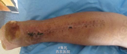 创口愈合满意,踝屈伸约30°~40°,给改行0°石膏加大活动范围再继续固定2周。