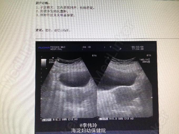 查体:生命体征平稳,心肺未见明显异常。双下肢无水肿。 妇检:阴道内见少量鲜红色血液。宫颈肥大,光滑,可见纳氏囊肿,宫口闭合,质地正常,无举痛,无接触性出血。宫体正常大小,前位,质地中,无压痛,活动度好。双侧附件未扪及明显包块。 辅助检查:血常规hb64g/L。尿蛋白定性(+),潜血(+)、红细胞11/uL,。B超:子宫稍大,宫内异常回声,大小约2×1.4cm,宫颈纳氏囊肿,左侧卵巢囊肿。
