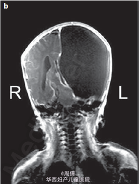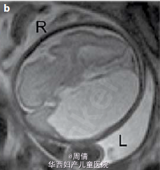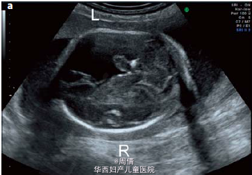 1,2.超声提示在大动脉分叉点以上的降主动脉上有一个动脉瘤,最大直径2cm 3,可见扩大的左脑室和变薄的左侧大脑实质 4,30周时胎儿MRI提示颅腔内的左侧脑室有一个增大的囊性结构