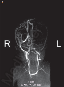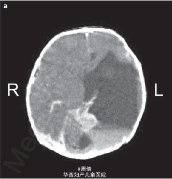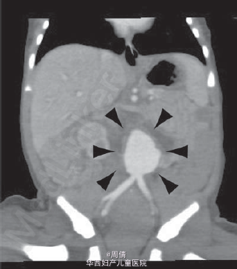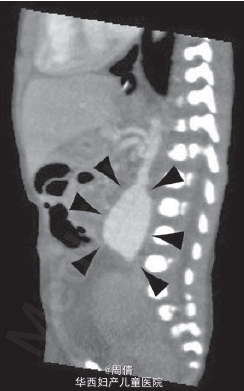 诊断为先天性腹主动脉瘤合并脑穿孔 继续妊娠,孕40周时孕妇产下一个2770g的男婴 体检提示婴儿腹部有一直径2cm的肿块 腹部CT提示降主动脉处有一直径2cm的动脉瘤 脑部CT提示左侧脑室有一囊性结构 出生第三天,MR血管造影提示胎儿期的左颈内动脉阻塞 婴儿6个月时复查腹部CT,提示降主动脉动脉瘤无明显增大,左肾动脉狭窄 因为移植如此小的血管困难太大,所以并未进行手术治疗 但是使用了VP分流器来阻止脑积水的进展