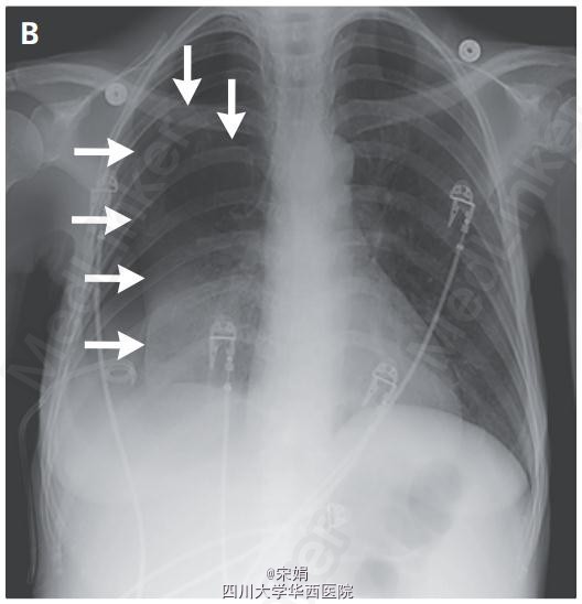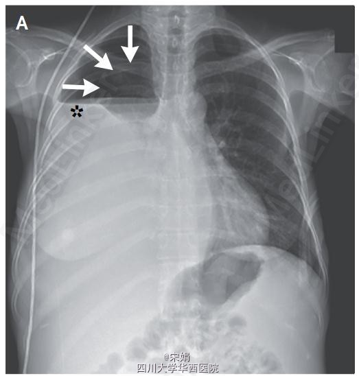 患者为46岁女性,呼吸困难就诊,患者因终末期肝病出现复发性肝性胸水,需要反复胸腔穿刺。胸部检查发现右肺无呼吸音。胸片显示液气胸(图A,箭头显示气胸,星号显示液胸)。遂留置猪尾导管引流胸腔积液,但气胸仍持续存在(图B,箭头)。