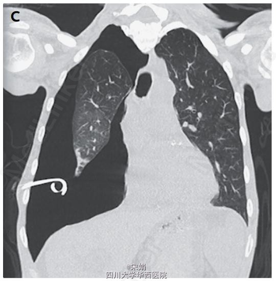 胸部CT扫描发现肺萎陷(伴脏层胸膜增厚,且无气管内梗阻表现(图C)。