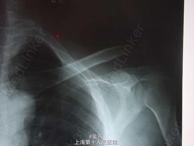 诊断:左肩锁关节三度脱位。 处理:完善术前准备后予行左肩锁关节脱位切开复位,修复喙锁韧带、肩锁韧带,锁骨钩钢板固定。