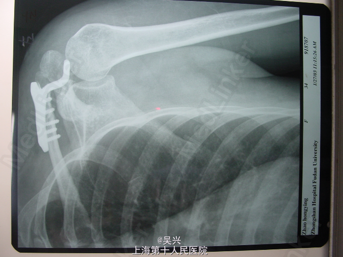 随访:术后第二天患肢三角巾悬吊保护下,左肩主动外展,前伸活动,三周后去除三角巾左肩主动功能锻炼,6周左肩功能恢复正常。 讨论:肩锁关节三度脱位是切开复位的指证,手术方式很多,其中锁骨钩钢板固定是其中一种有效的方法,但需注意锁骨钩切勿太深、太长,以免损伤肩袖,影响肩关节功能,术中应该注意修复喙锁韧带、肩锁韧带,以免发生内固定失败和脱位复发。