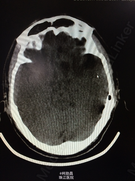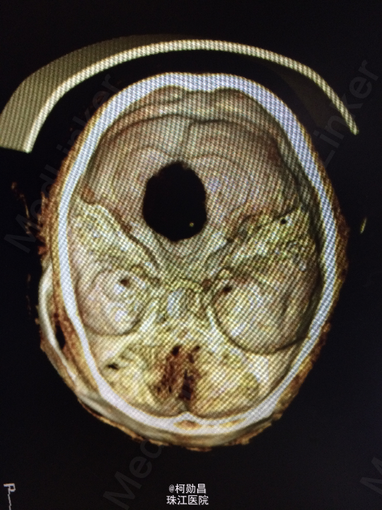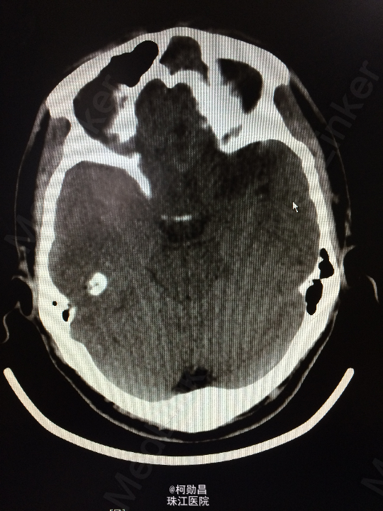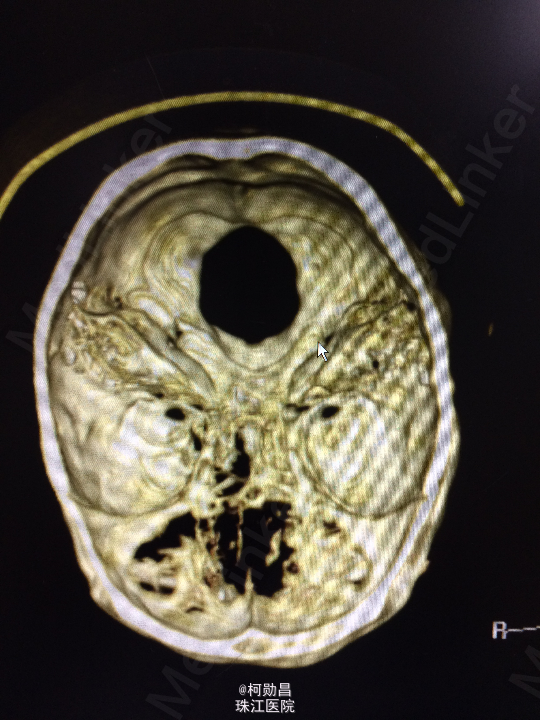 主诉:头痛伴左眼视力下降半年 病史:患者46岁男性,缘于半年前无明显诱因出现头痛,当时未予特殊处理,后症状进行性加重,并发左眼视力下降,于当地医院行头颅CT及MR检查提示颅内占位,为进一步治疗而入我院。 既往病史:5年前曾患鼻咽癌