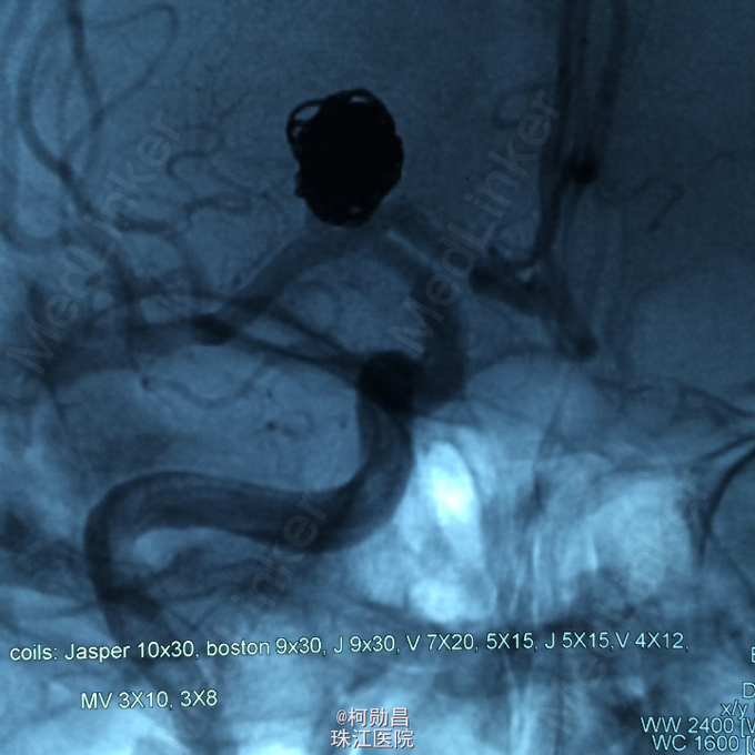 随访:患者症状缓解后出院 讨论: 血管内栓塞治疗为动脉瘤的首要治疗方案,但要注意栓塞后血管再通的问题。