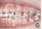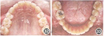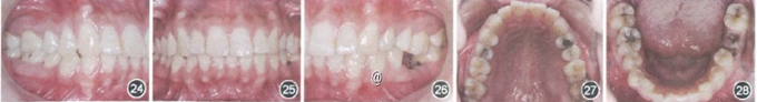 检查:磨牙、尖牙均为远中关系;II度深覆骀,Ⅱ度深覆盖;36残根(图24~29)。x线片显示,38缺失。