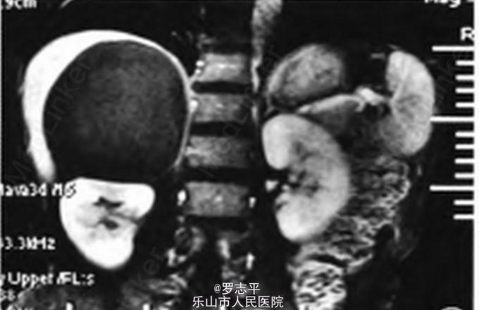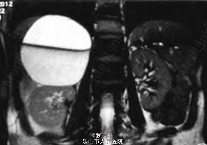 彩色多普勒超声检查示右肾上腺区有一10.2 cm×9.2 cm的囊性结构,内见分隔,周边可见钙化。MRI示检查右侧肝肾间隙有一约11.0 cm×l0.0 cm×7.3 cm巨大肿物,边缘清晰,包膜完整,内可见分隔,考虑囊肿