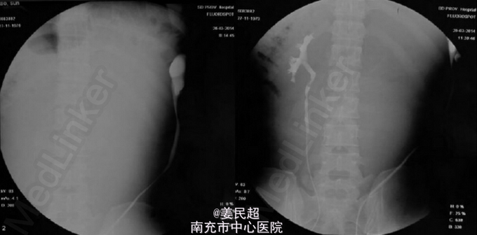 患者术前准备充分后,于气管插管全麻下行腹腔镜探查术,术中探查发现患者为左侧完全重复肾输尿管合并上肾重度积水,遂行左侧重复肾输尿管切除术(上肾) ,术中吸引器共收集左上肾积水量约为8000 ml,手术顺利。术后5天拔除左肾周引流管,后患者顺利出院。术后1个月复查B超示左侧下肾较前无明显变化,血清肌酐水平与术前水平相似。