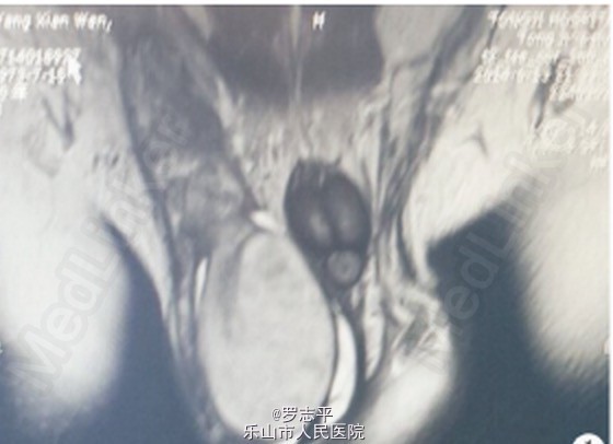 查体:右侧睾丸明显肿大,沉重感,触之质硬,无压痛,右侧精索明显增粗 MRI示:右侧睾丸及附睾异常信号增大,右侧睾丸大小58 mm×44 mm,T1 WI 信号大致均匀,T2 WI 信号稍欠均匀,呈散在点状稍低信号改变,DWI扫描信号均匀,右侧附睾精索明显增粗并呈显著不均匀强化改变,考虑肿瘤