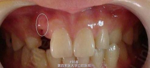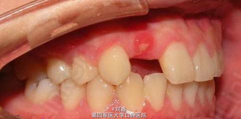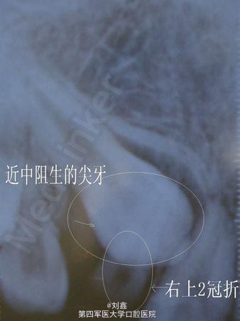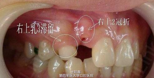 1.右上乳尖牙滞留,右上尖牙近中阻生。 2.右上侧切牙冠折。 3.左上尖牙反合及上前牙不齐。
