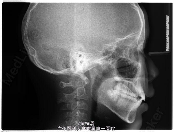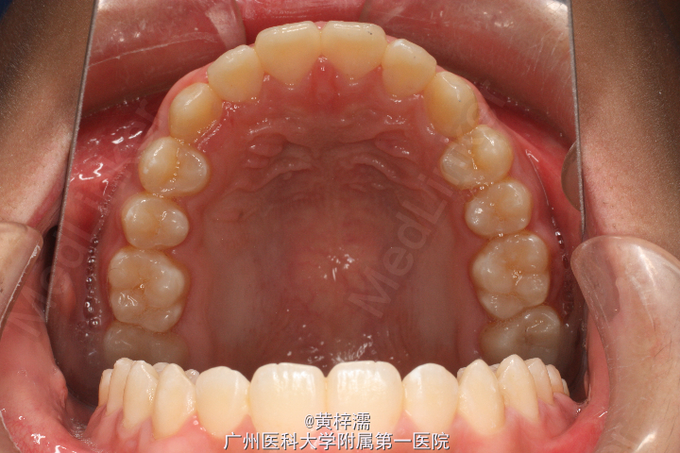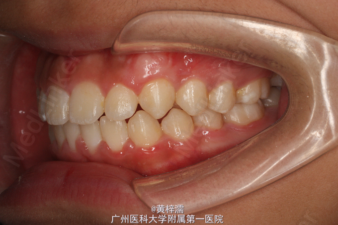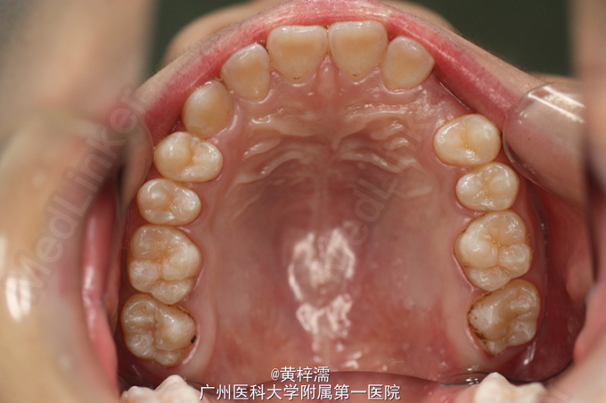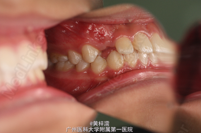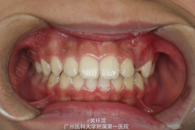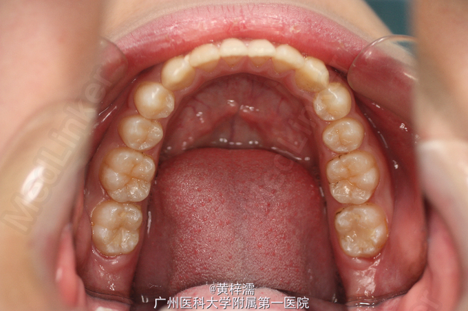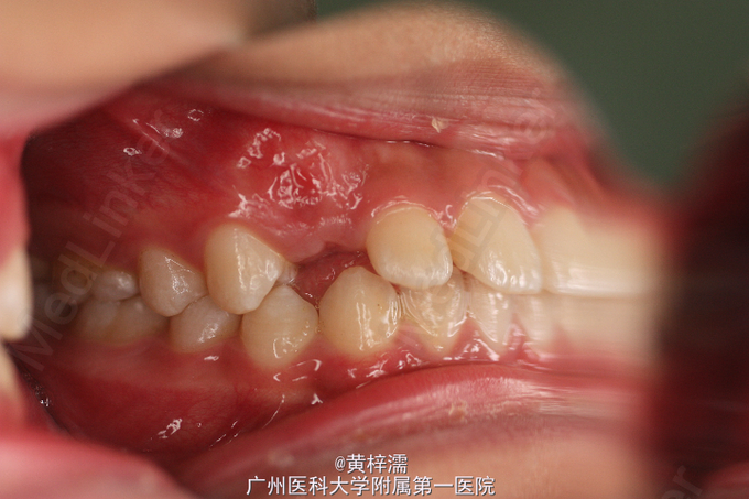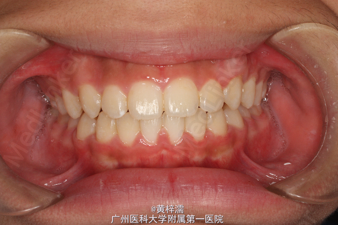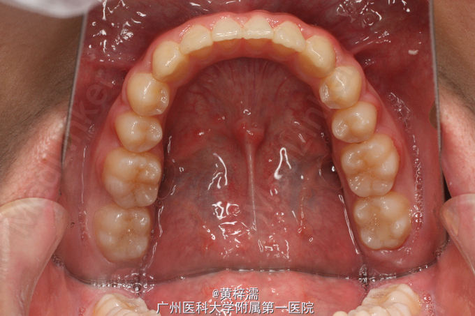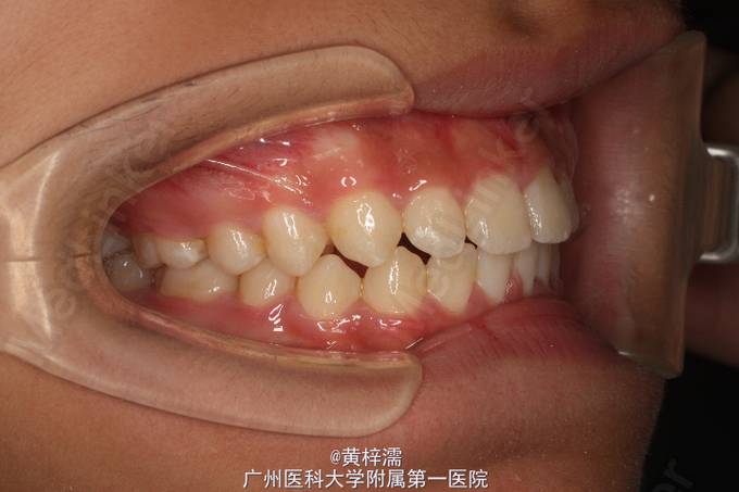 面部基本对称,无露龈笑,笑容不自然。直面型,面中1/3高度与面下1/3高度基本相等。下颌后缩,颏部发育稍不足。上中线与面中线一致,下中线稍右偏0.3mm。左侧磨牙关系中性,无尖牙关系。22,24间前庭沟下方可见鼓起,扪及23,磨牙覆盖正常。右侧磨牙关系中性,尖牙关系1/4远中,磨牙覆盖正常。上牙弓卵圆形,23缺牙间隙8.5mm,13宽度为8.5mm。口腔卫生可,未见牙体、牙周疾病,颞下颌关节检查未见异常。