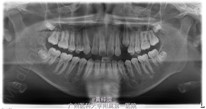青少年男患者,13岁主诉:左上前牙未萌。现病史:左上前乳尖牙替换后恒牙未萌,2012年曾于外院行切龈术。既往史:无特殊。家族史:否认家族遗传史