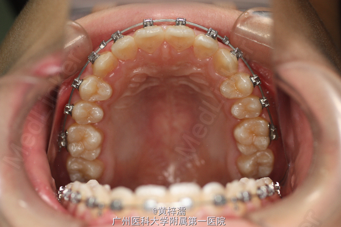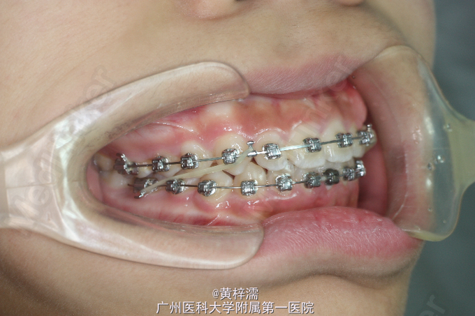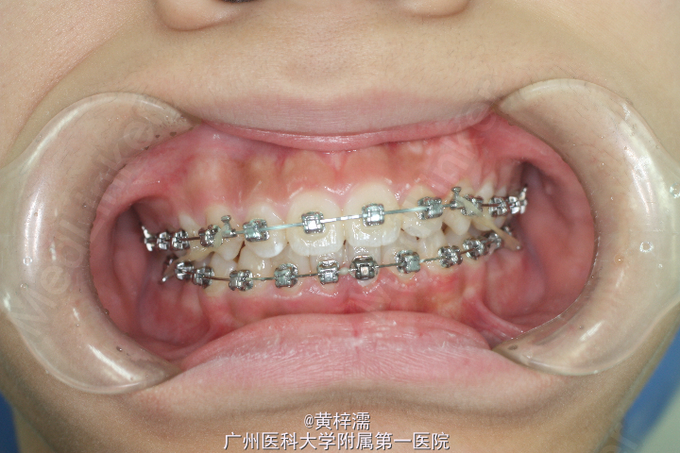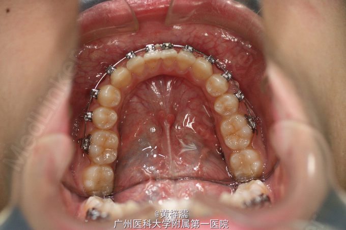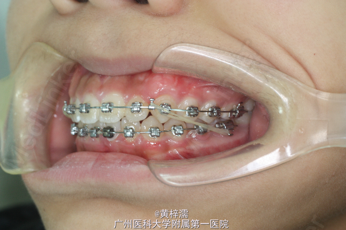 患者对治疗效果满意,拆除保持器维持1年。讨论:在判断阻生尖牙是否能自行萌出首先需判断阻生牙的倾斜角度及与侧切牙重叠位置,一般阻生超过侧切牙牙根1/2的阻生牙较难自行萌出,第二需要观察尖牙牙根发育状况而定。本患者尖牙已无自行萌出的趋势,因此行正畸牵引。 处理此类阻生尖牙时,首先粘接牵引附件需要确定牵引方向,控制牵引过程牙根不能碰及邻牙;其次牵引阻生牙时,牙列主弓丝必须时硬丝,利用短NITI丝段对阻生牙进行牵引,这样可以避免牵引过程对邻牙产生影响,稳定牙弓。第三,牵引后需要观察牙根方向和轴向,如不佳需要调整为好。
