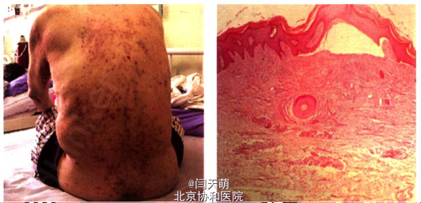 男,78岁。因胸背四肢起红斑、水疱伴瘙痒半年入院。半年 前患者无明显诱因胸、背起红色斑疹及小 水疱,自觉瘙痒,随后皮疹逐渐扩大,症状加重,曾在外院诊断为“湿 疹”、“药物性皮炎”,给予抗过敏治疗,无明显疗效。近1个月,患者自觉皮疹扩展到双上肢伸侧及双下肢近端皮肤,口服抗组胺药物治疗不能缓解。患者既往有慢性支 气管炎史24年,口服药物治疗至今。1年前诊断“骨髓增殖综合征及原发性血小板增多症”,予羟基脲及干扰素治疗。