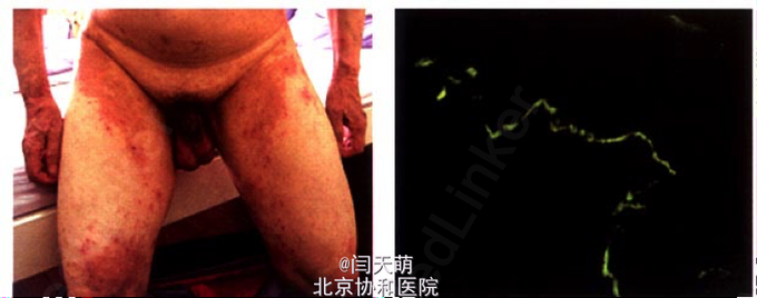 体检:一般情况可, 心、肺、腹检查无异常。皮肤科检查:躯 干、四肢可见不规则形大小不等水肿性红斑,相互融合成大片,间有正常皮肤,在红斑表面及边缘可见黄豆大小半球形水疱。在正常皮肤上亦可见张力性水疱,部分直径>0.5 em。疱壁厚不易破, 疱液清,尼氏征阴性,未见明显糜烂面但。实验室及辅助检查:血常规:白细胞14.86×10^9/L血小板829.0×10^9/L,皮损组织病理示:表皮与真皮分离,嗜酸粒细胞伴少量中性粒细胞浸润.直接免疫荧光:基底膜带I如及C3沉积,间接免疫荧光基底膜带IgG沉积 1:10。骨髓象:各系细胞基因分型正常.