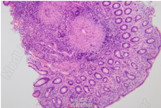 体格检查:T:36.6℃ P:71次/分 R:19次/分 BP:98/58mmHg。腹部查体:腹部软,未扪及包块,右下腹压痛阳性,无反跳痛,余腹部查体无异常,肠鸣音正常。 辅助检查:血常规、输血4项、D二聚体、生化、肝功、心酶、凝血、甲功、免疫6项、CEA、CA199、AFP、尿常规等未见明显异常;粪便常规正常;结核抗体阴性;血沉:29mm/h,C-反应蛋白:12.6mg/L,血脂:TC:3.06mmol/L,HDL-C:0.91mmol/L。胸片、心电图正常。血管炎抗体3项、自免12项未见异常。6月28日行小肠镜检查:、距肛缘约50cm处横结肠、距肛缘约35cm处降结肠可见节段性分布的深大溃疡,被覆白苔,周边粘膜呈息肉样增生,部分呈铺路石样,活检5块送病理。病理示:(升结肠粘膜活检)肠粘膜慢性炎:1.固有膜内慢性炎细胞浸润:重度; 2.中性粒细胞浸润:大量;3.隐窝脓肿:无; 4. 黏膜糜烂溃疡:有;5.隐窝(上皮增生:轻度;不典型增生:无;杯状细胞减少:轻度;潘氏细胞化生:无;腺体萎缩:无)6.炎性息肉形成:无;7.结核样肉芽肿:有。