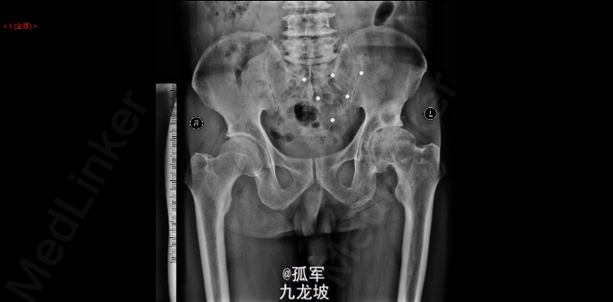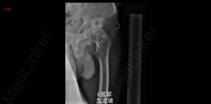 左髋部疼痛4年,加重伴跛行5月。 74岁老年男性,4年前,患者无明显诱因出现左髋部疼痛,5月前,患者觉左髋部疼痛较前加重,行走数百米及爬楼梯后疼痛加重明显,伴跛行及夜间疼痛,不伴双下肢麻木及游走性关节疼痛,卧位时疼痛可减轻。3月前患者自行购买口服药物止痛治疗,左髋疼痛有轻度缓解,可在跛行状态下行走约500m。