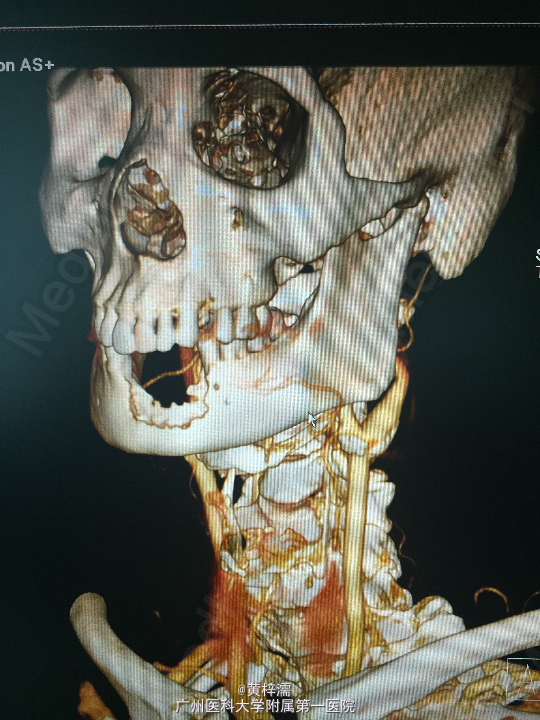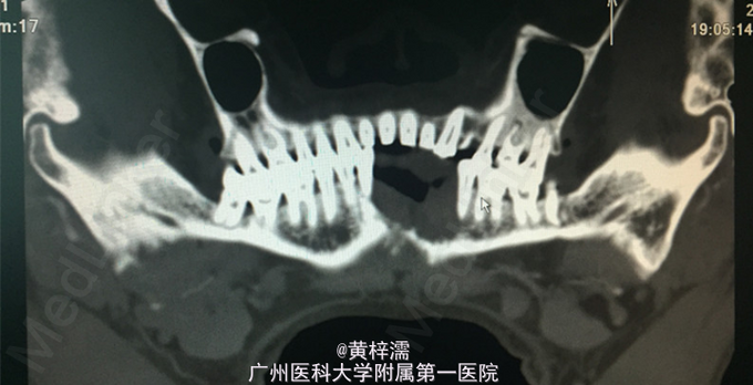 主诉:下前牙区疼痛出血6月余,发现下颌肿物3天。1月前曾于外院拔除部分下前牙,出血加重,疼痛症状无明显缓解,于外院诊治未作处理。