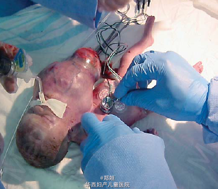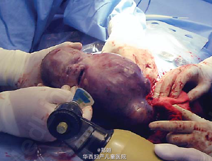 孕26周,大量羊水和早期宫缩出现 使用糖皮质激素 MRI提示,胎儿27周龄,颈部前方气道的地方有一9cm大小的肿块 抽取羊水1250ml并未减轻孕妇的不适和宫缩 孕28+4周破膜,行剖宫产,产下一男婴 术中尝试多种插管方式,硬性或软性的支气管镜检均失败 可见胎儿颈部有一巨大的肿块伸向胸部上方 手术切除该肿块,550g