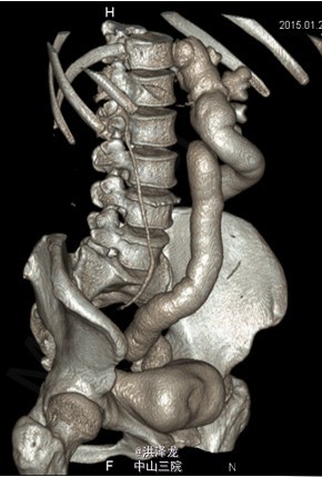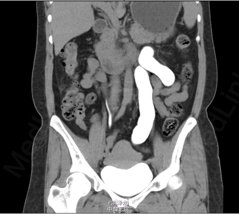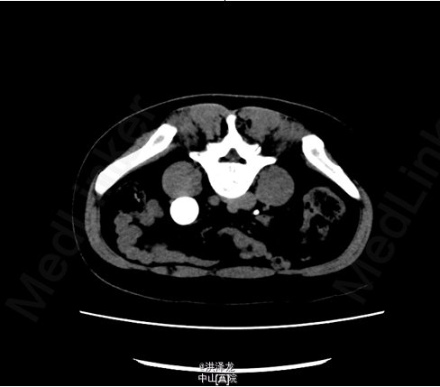 患者,女性,46岁。下腹胀痛半年。患者于6月前无明显诱因出现下腹部闷痛不适,无尿频、尿急、尿痛,无排尿困难,无血尿、脓尿,在当地医院行B超检查提示:左侧巨输尿管伴左肾 积液。现为进一步诊治收入我科。
