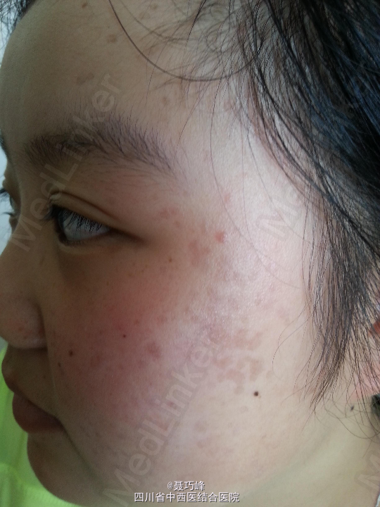 何某,女,12岁,面部扁平疣2年,自述2年前无明显诱因额头出现绿豆大小扁平疣体,高出皮肤表面,呈皮肤颜色,无痒痛不适,未予重视。1月前患者面颊部及下颌亦出现类似疣体,小如芝麻,大如绿豆形状不规则扁平疣体,皮损呈密集性分布,时有瘙痒不适,抓之疣体颜色变红。于当地医院诊治,诊断:扁平疣。给予外用药物(具体不详)自觉疗效欠佳,为寻求中医治疗,至我科诊治。诊断:扁平疣。患者情绪焦虑,食欲可,眠差,大小便正常,舌红,苔黄,脉弦。