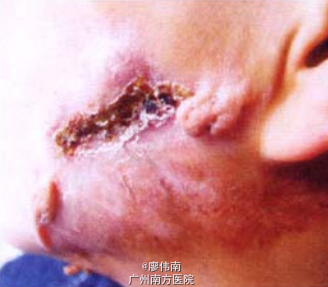 男,14岁。因“双侧颌角区及颈部结节、溃疡、结痂伴瘙痒10年”就诊。4岁时双侧面颊颌角区及两侧颈部下段出现皮下结节,质硬,无疼痛,伴瘙痒。结节渐增多,溃破,并有脓性分泌物。不久溃疡自愈,形成瘢痕。损害反复发生。患者叔叔、奶奶有肺结核病史。