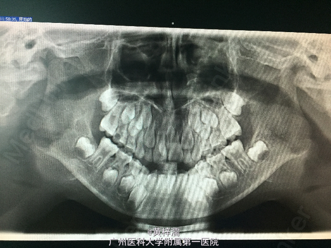 全身检查无特殊。专科检查:口腔卫生可,11、21已萌出,未见牙体病损,无叩痛和松动,牙髓活力正常,11腭侧见白色牙状物,无叩痛和松动。腮腺检查和颌下腺检查未见异常。外院CT提示:符合多生牙,左侧多生牙包埋于囊腔中,囊腔大小为1.5*1.5cm;外院根尖片提示11、21间见多生牙2枚,左侧多生牙冠周见囊性阴影。