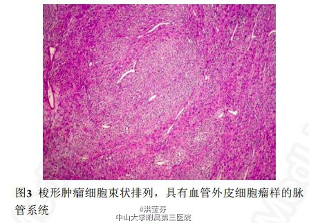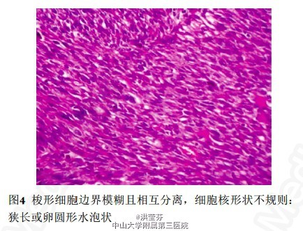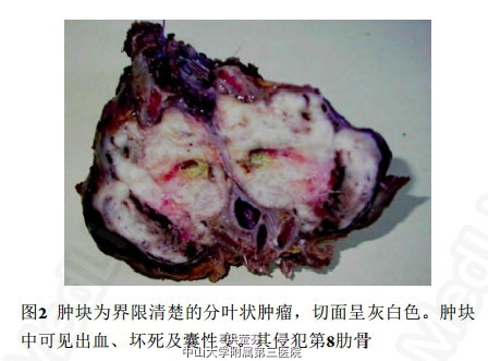 诊断胸壁恶性肉瘤。对患者行胸壁切除术,同时切除受累及的肋骨。切除的肿块大小为12 cm ×5.5 cm ×3 cm,外观为坚硬、相对的界限清楚及分叶状,切面呈灰白色。肿块中可见出血、坏死及囊性变。其广泛侵犯第8肋骨和邻近第6和第7肋骨的软组织(图2)。病理证实为胸壁滑膜肉瘤(图3~4)。术后常规采用阿霉素和和乐生进行辅助化疗,然而治疗过程中失访。