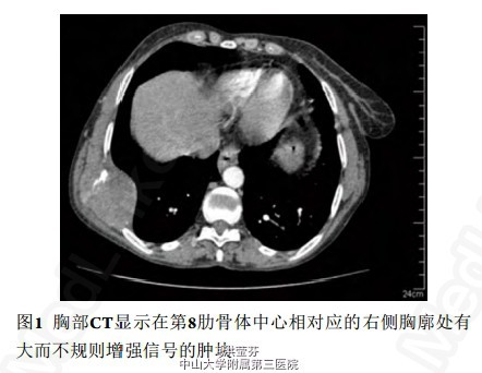 6个月后,患者再次就诊时发现,胸壁出现复发的巨大肿瘤。CT扫描发现复发的胸壁肿块及对侧肺转移。患者3天后死亡。 滑膜肉瘤是罕见的未知组织来源的恶性肿瘤,常影响下肢且发生于关节或腱鞘的附近。滑膜肉瘤的症状依赖于肿瘤是否压迫或侵犯周围组织。胸壁滑膜肉瘤的治疗需要联合根治性切除术、术后放疗和辅助化疗而进行综合治疗。由于其易复发,因此需要定期随访。较差的预后与男性、发生于躯干而非末端组织、病灶超过5厘米、高恶性组织学分级(有丝分裂速度和肿瘤坏死)、神经血管的侵犯、异倍体、低分化及局部复发等因素有关。doi: 10.3978/j.issn.2095-6959.2015.01.010