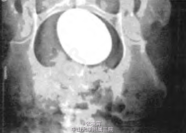 查体:生命体征无异常,心肺未见异常,下腹部压痛,下腹部正中可触及1个包块,质硬,约13 cm×12 cm。 实验室检查:血钙2.46 mmol/L,血磷1.67 mmol/L;白细胞11.5×109/L;肾功能未见异常;尿常规:白细胞满视野/HP; B超示:膀胱区域呈现强回声后伴有声影,12.8 cm×11.0 cm×10.9cm。 腹部平片示:盆腔膀胱区域呈现有一椭圆形分层致密高密度影,12 cm×11 cm×10 cm。