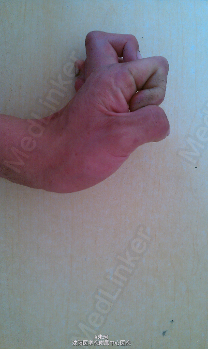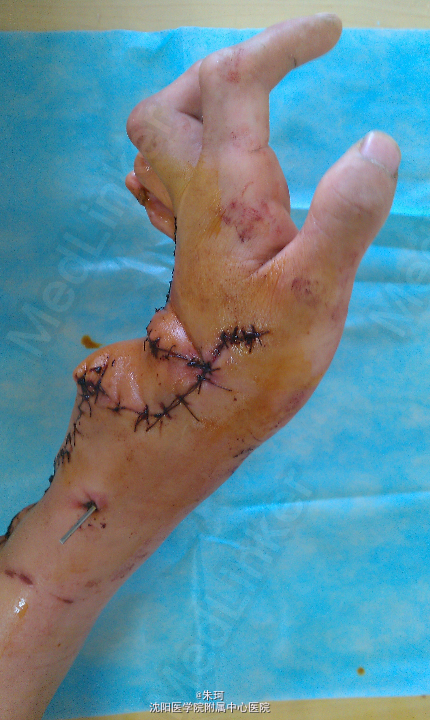 诊断:左手术后畸形 手术切除瘢痕,腕关节中立位、掌指关节屈曲位固定,手背皮肤缺损以皮瓣修复。