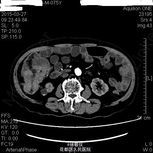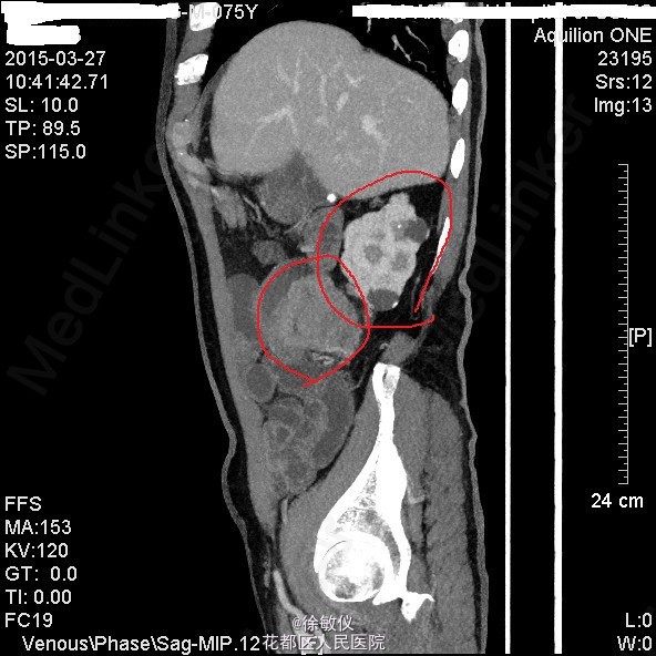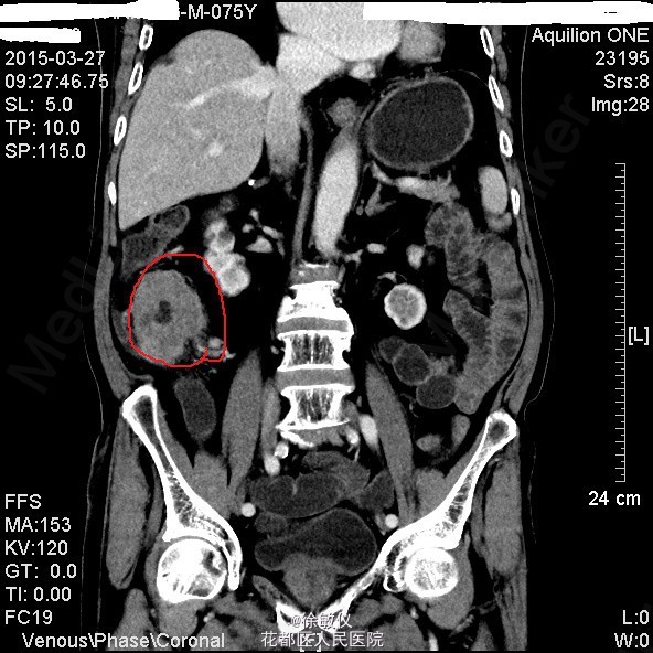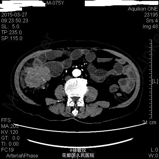 查体:生命体征平稳,贫血面容。腹软,全腹无压痛、反跳痛,右中腹可触及一大小约4*5cm包块,边界清晰,质稍硬。肝脾肋下未触及。 辅查:HGB 82g/L;CA19-9 625.97U/ml;CA-125 24.9U/ml;大便常规示:粪血红蛋白试验阳性。 全腹CT平扫+增强示:1、结肠肝曲及升结肠癌,浸润肠壁全层,周围多发淋巴结转移;2、直肠多发小息肉;直肠下段静脉曲张。