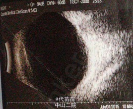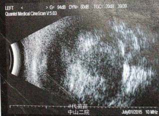 体格检查:专科检查:左眼上睑轻水肿,结膜混合充血明显,瞳孔区白色反光,对光-,角膜轻水肿 辅助检查:1.右眼玻璃体混浊,球壁不光滑声像2.左眼内实性占位性病变声像