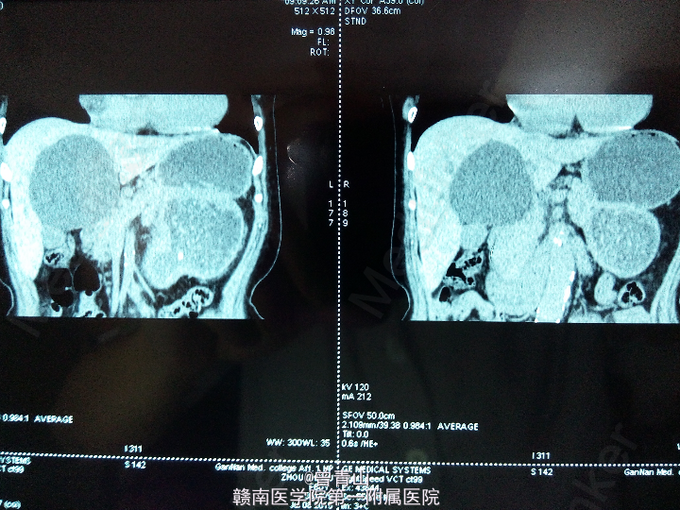 患者,女性,61岁,因“体检发现肝囊肿进行性增大4年余”入院。无明显不适症状。