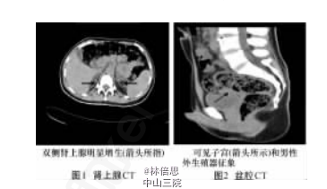 神清,全身皮肤颜色较黑,喉结轻度发育。双侧乳房发育为TannerⅠ期。阴毛发育为TannerⅤ期,呈男性分布,睾丸未扪及,阴囊缺如。肾素、醛固酮、香草扁桃酸正常。尿 17 酮类固醇59.8mg/24小时妇科彩超:双侧卵巢显像正常,右侧卵巢见一直径约2.7*1.6卵泡。染色体分析:46,XX