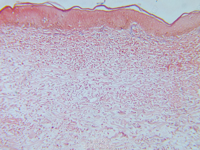 体格检查:慢性病容,精神差,消瘦,双腋下、双腹股沟可及多个黄豆至蚕豆大小肿大淋巴结,质韧,活动度差,无触痛。心肺查体未见明显异常。左下腹可见人造肛。全腹部无压痛,无腹胀。皮肤科情况:左臀部弥漫性暗红色斑块,其内多个大小不一深在性溃疡,有少许淡绿色脓性分泌物。斑块周围皮肤、颈部两侧、双腋下、腰背部、腹部、双侧腹股沟皮肤明显松弛、褶皱增多,皮肤表面萎缩、干燥。双大腿皮肤呈皮肤异色样改变。 实验室及辅助检查:血常规白细胞6.22×109/L,中性粒细胞百分比71%, 淋巴细胞百分比11.9%↓, 单核细胞百分比8.3%↑, 嗜酸性细胞百分比6.9%↑,红细胞4.45×1012/L,血红蛋白110 g/L↓, 血小板292×109/L。尿常规白细胞 125cells/μl↑,蛋白质 0.3g/L↑,红细胞 200cells/μl↑;肝肾功能示白蛋白 27g/L↓,肌酐196μmol/L↑,尿素氮 7.34mmol/L↑。淋巴细胞亚群分析示CD3+T% 57.8%↓,CD4+T% 26.8%↓,B% 33.2%↑。乙型肝炎病毒表面抗原(HbsAg)、丙型肝炎病毒抗体(HCV-Ab)、人类免疫缺陷病毒抗体(HIV-Ab)、梅毒快速血浆反应素试验(RPR)均阴性。免疫固定电泳未见单克隆蛋白。抗核抗体(ANA)、抗双链DNA抗体(dsDNA)、抗中性粒细胞胞浆抗体(ANCA)均阴性。脓性分泌物涂片抗酸染色阴性;脓性分泌物奴卡菌培养阴性,真菌培养阴性,铜绿假单孢菌(+++)。胸部CT平扫示右肺上叶后段结节钙化灶;右肺斑片、索条影,双肺小结节;双侧腋窝多发肿大淋巴结,皮下脂肪间隙模糊密度增高。腹部CT平扫示双肾结石,左侧肾盂扩张;右肾低密度影;脾大;腹膜后多发小结节影;直肠形态不规则;盆腔静脉石可能;双侧腹股沟多发肿大淋巴结;皮下脂肪密度弥漫性增高,左侧臀部软组织肿胀。双肾B超示双肾弥漫性病变,双肾多发结石,右肾囊肿,左肾积水。 组织病理检查: 1.(左臀部溃疡):角化不全,浅表溃疡,真皮浅层水肿,真皮内可见大量淋巴细胞、多核巨细胞浸润,多核巨细胞所含胞核多至40个,尚可见中等量的浆细胞及少量嗜酸性粒细胞浸润,真皮深层大片坏死。PAS染色阴性,抗酸染色阴性。弹力纤维染色示皮损处弹力纤维断裂、缺失。 2.(左颈部松弛处皮肤):表皮萎缩,基底细胞液化变性,可见单一核细胞移入表皮。真皮全层可见淋巴细胞、组织细胞弥漫性浸润,尚可见较多多核巨细胞,多核巨细胞所含胞核多至40个。弹力纤维染色示皮损处弹力纤维基本缺失。免疫组化示CD3(+),CD45RO(+++),CD43(+++),CD68(+),CD20(-),CD79α(-)。 3.(左臀部皮下包块,外院病理片):真皮至肌肉组织弥漫性淋巴细胞、组织细胞浸润,淋巴细胞核染色深,具有异型性,可见较多多核巨细胞,多核巨细胞核为10个左右。