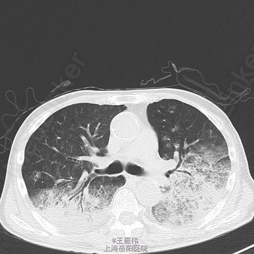 反复咳嗽咳痰气促3年,加重伴发热8日,患者3年前因咳嗽咳痰、气促至中山医院就诊,诊断为“肺部恶性肿瘤”,予手术治疗,具体诊疗过程不详。之后患者长期口服特罗凯、吉诺通等药物,仍时有咳嗽咳痰。8日前患者无明显诱因下出现发热,T最高:38.5℃,咳嗽咳痰、气促加重,夜间尤甚,咳白色泡沫痰,量多。至我院急诊就诊,查CRP:34.95mg/L,血常规:WBC10.3*10^9/L,N79%,予邦达抗感染治疗后,患者热退,仍时有咳嗽咳痰,2日前再次发热,T:38.5℃,复查CRP:24.09mg/L,血常规:WBC8.4*10^9/L,N77%,