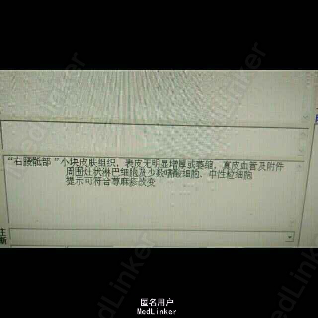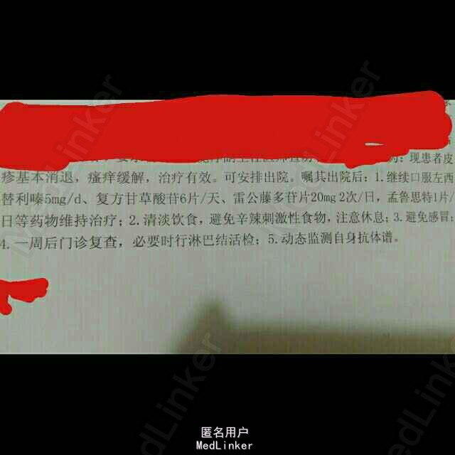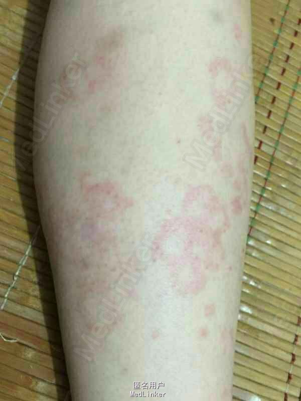 女,38岁,以躯干,四肢红斑瘙痒伴发热半年入院 半年前于药厂上班后自觉躯干,四肢皮肤瘙痒,出现大量红斑,融合成大片,出现发热,乏力,纳差,体温最高38度,午后为重,伴游走性关节疼痛,用药后稍缓解。