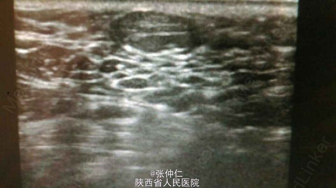 男,25岁,2年前无意间发现左腕部包块,约花生粒大,无压痛,质韧,边界清楚,搏动感明显,包块逐渐增大至板栗大小。