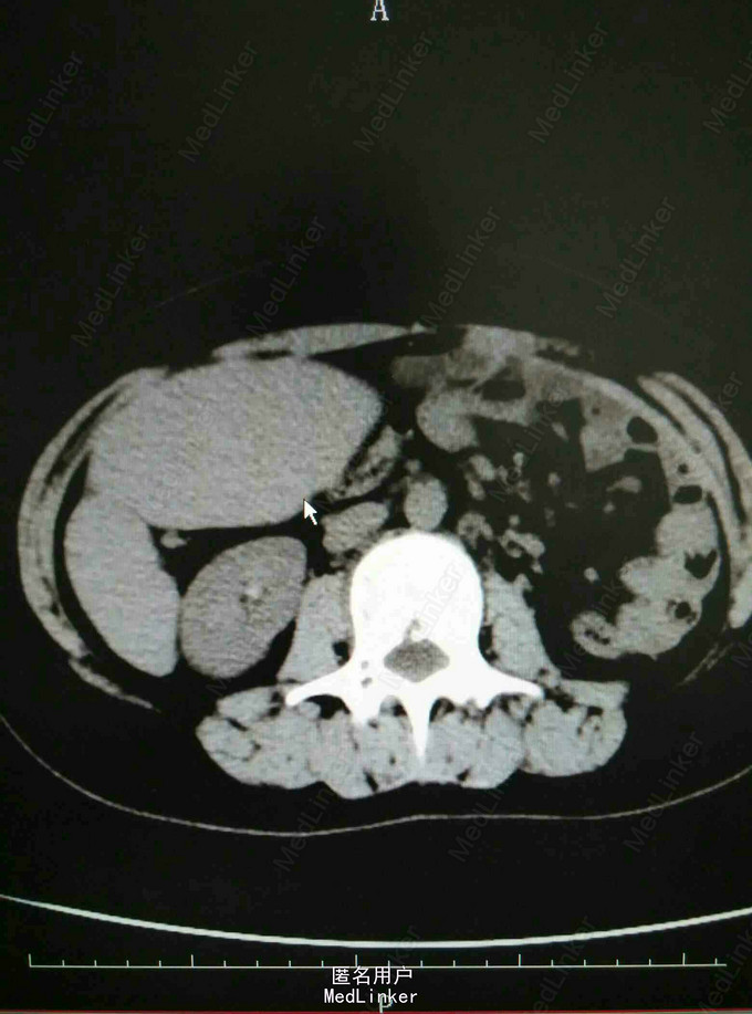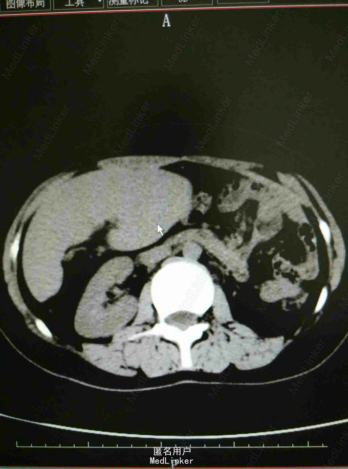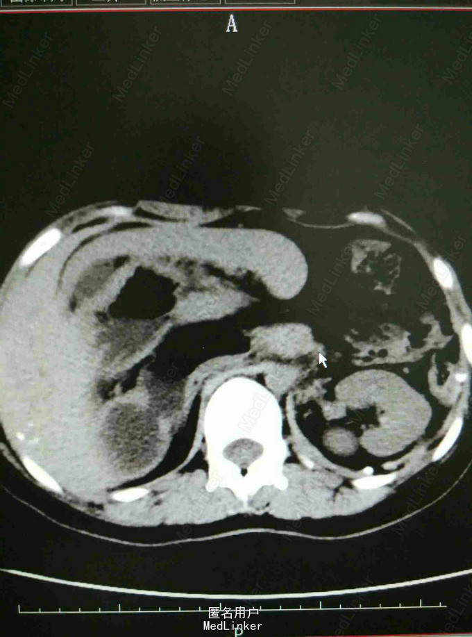专科查体:腹平软,未见胃肠型及蠕动波,未见腹壁静脉曲张;全腹无压痛,反跳痛,肝肋下未及,胆囊未触及,右肋下脾脏可触及,Murphy征阴性;叩诊鼓音,未及移动性浊音,肠鸣音正常,肛门指检未检。入院总蛋白、白蛋白正常,白细胞2.50*10 9/L,红细胞4.36*10 12/L,血小板172*10 9/L,CT提示内脏移位,脾大,余检查无特殊。