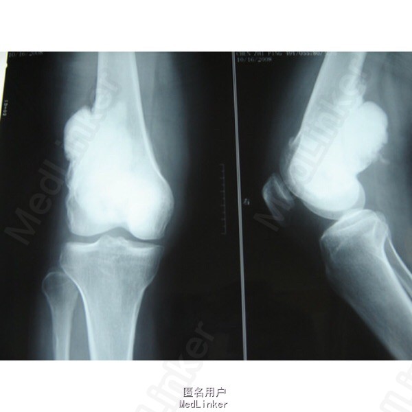 查体: 左膝上肿大,表皮发红,可見有怒张的皮下静脉,触及质硬,无话动性皮肤温度高,压触痛明显,膝关节伸屈活动受限,腹股沟淋巴结未明显触及。 辅助检查: x线检查左股骨下端高密度肿瘤影,环绕股骨周围,硬化,界限尙清,瘤体增生性改变,无骨膜反应。