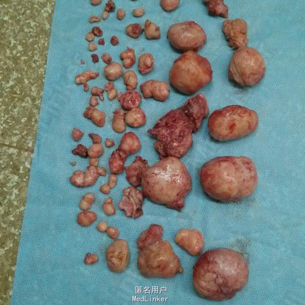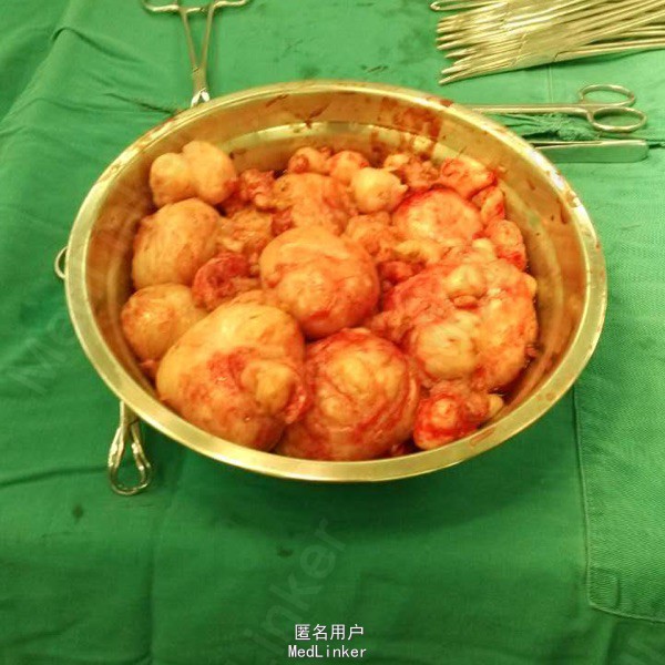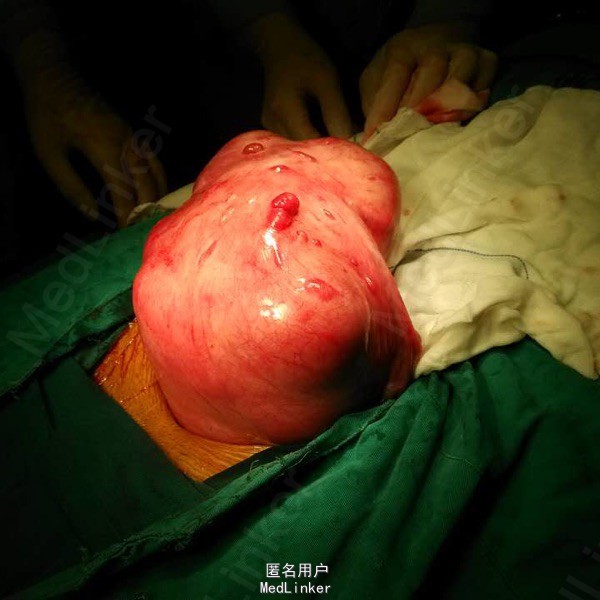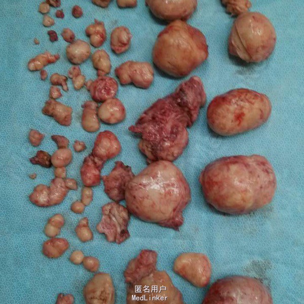 患者在全麻下行腹式子宫肌瘤剔除术。共剔除出子宫肌瘤95个。术中出血多,予输血治疗。术后缩宫素止血、抗感染等对症支持治疗。术后病理示富细胞性平滑肌瘤。