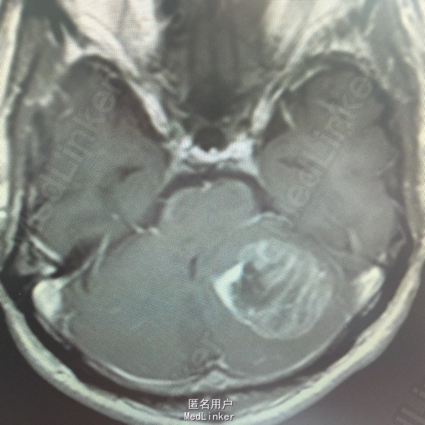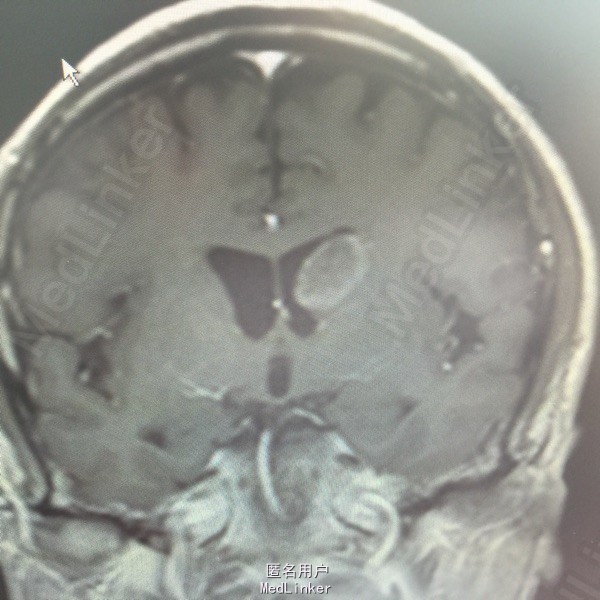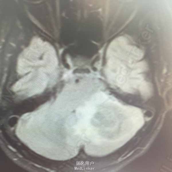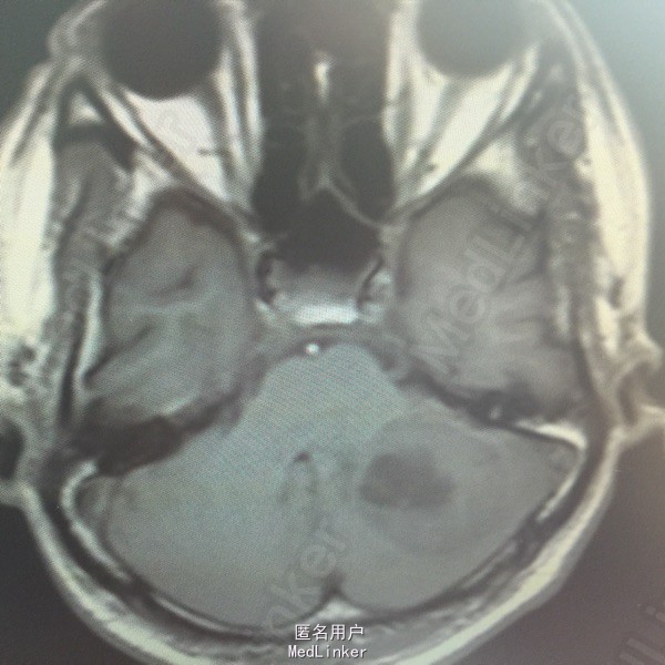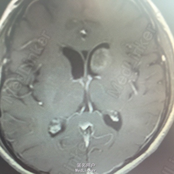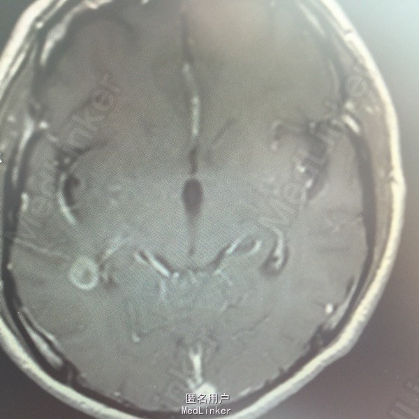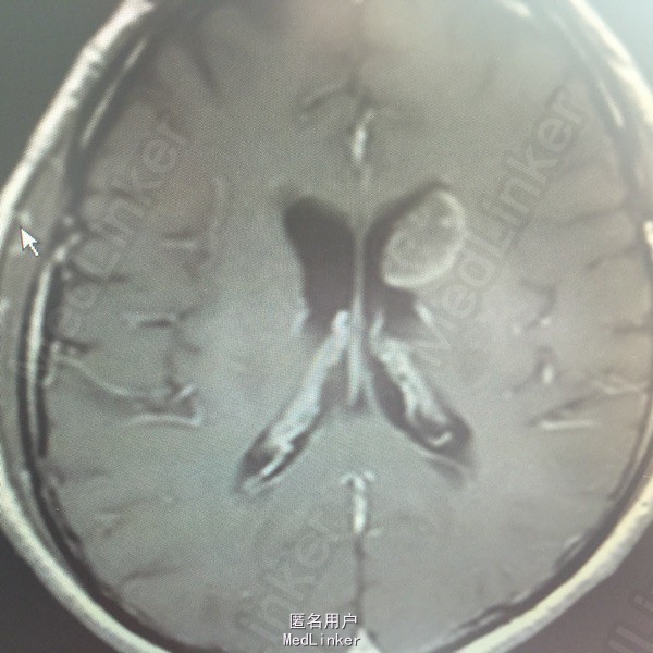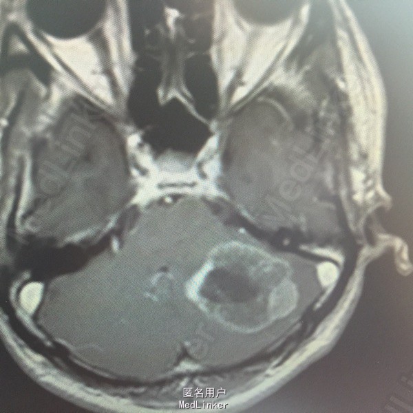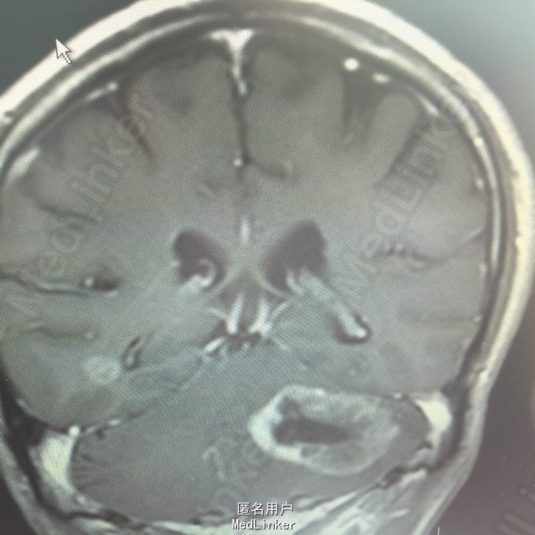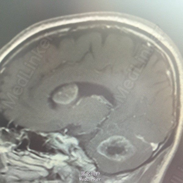 肺癌脑转移。 影像解读(影像如何解读是临床工作中非常重要的一环)。 左侧额叶近皮质长Tl长T2信号,局部颅骨缺损,右侧枕叶不规则病灶,TlWl呈中心呈等信号,周围高信号,T2Wl呈高低混杂信号,伴大片水肿,相邻侧脑室后角、胼胝体受压。增强呈不规则环环强化。 已进行局部放疗治疗。