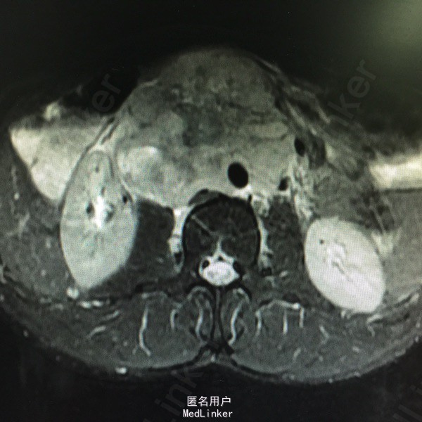 查体:上腹少许压痛,中腹部可门机一大小约8*8cm的肿物,质地硬,活动性差,无明显按压痛。其余无特殊。 辅助检查:腹部MR:1.腹膜后占位(80*92*147cm),考虑淋巴瘤可能性大,病灶推压下腔静脉、门静脉主干及胰腺,包绕腹主动脉、肠系膜上动脉、双侧髂血管及双侧肾动脉,双侧肾静脉显示不清。2.肝左叶内胆管轻度扩张。胃镜示:1.慢性浅表性胃窦炎,2.胃窦粘膜隆起待查:异位胰腺?B超引导下行肿物穿刺活检术,病理结果示:符合生殖细胞来源恶性肿瘤,考虑精原细胞瘤可能性大。后完善盆腔CT示:1.右侧睾丸肿物,性质为恶性肿瘤,考虑为精原细胞瘤可能,阴囊右侧积液,腹膜后、肠系膜根部、盆腔内多发淋巴结转移,不除外累及胰头、体部、右侧腰大肌可能,下腔静脉、双侧髂总、内静脉、右髂外静脉、股静脉腔广泛栓子形成;盆腔少量积液。