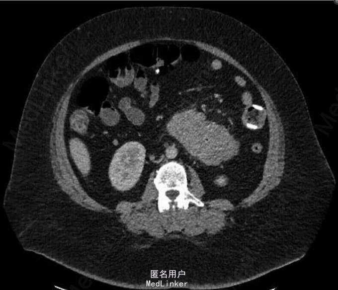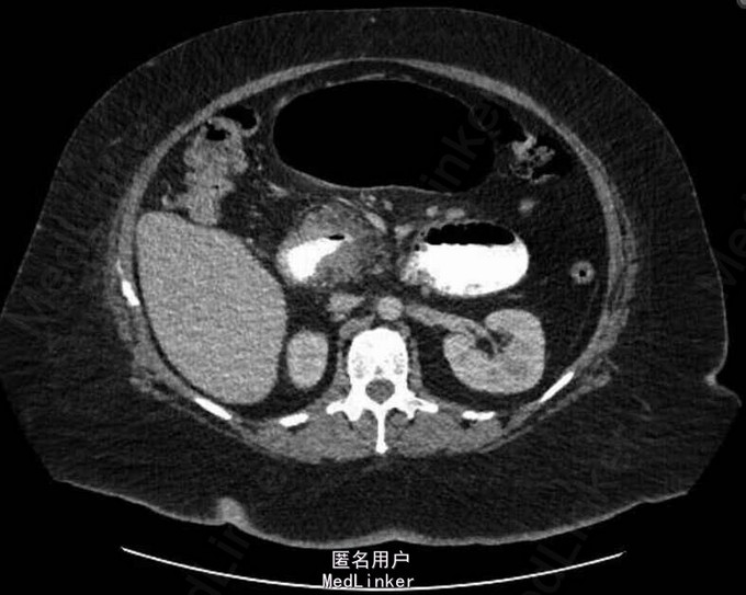 患者46岁女性,因“厌食、上腹部疼痛,伴有发热以及呕吐”入院。呕吐物为胆汁。她5年前曾因140kg行可调节胃束带减肥手术,但术后体重仍然在130kg波动。目前体重是131kg。余病史无特殊。