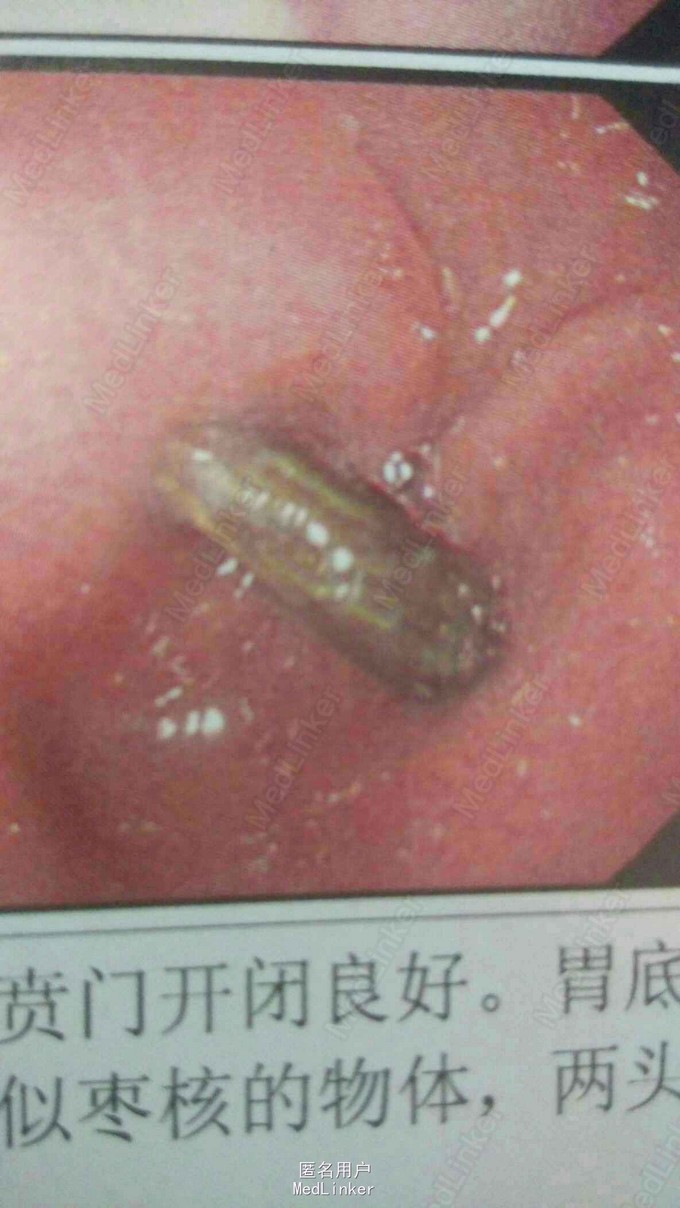 神志清楚,呼吸平稳,一般状态好,心肺无异常,心率每分钟68次,律齐,腹软无压痛,肝脾未触及,双下肢无浮肿。 內镜下提示:胃內异物。