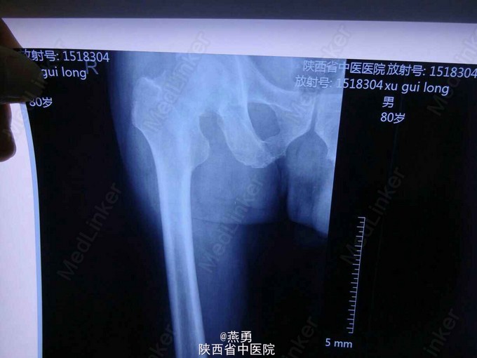 81岁男性患者,一个月前不慎摔倒右髋部着地,当即右髋部疼痛,活动困难,被动活动疼痛明显加重,近来患者自觉疼痛无缓解,活动受限,遂到我院就诊。 患者五年前曾在其他医院行结肠癌根治术 。