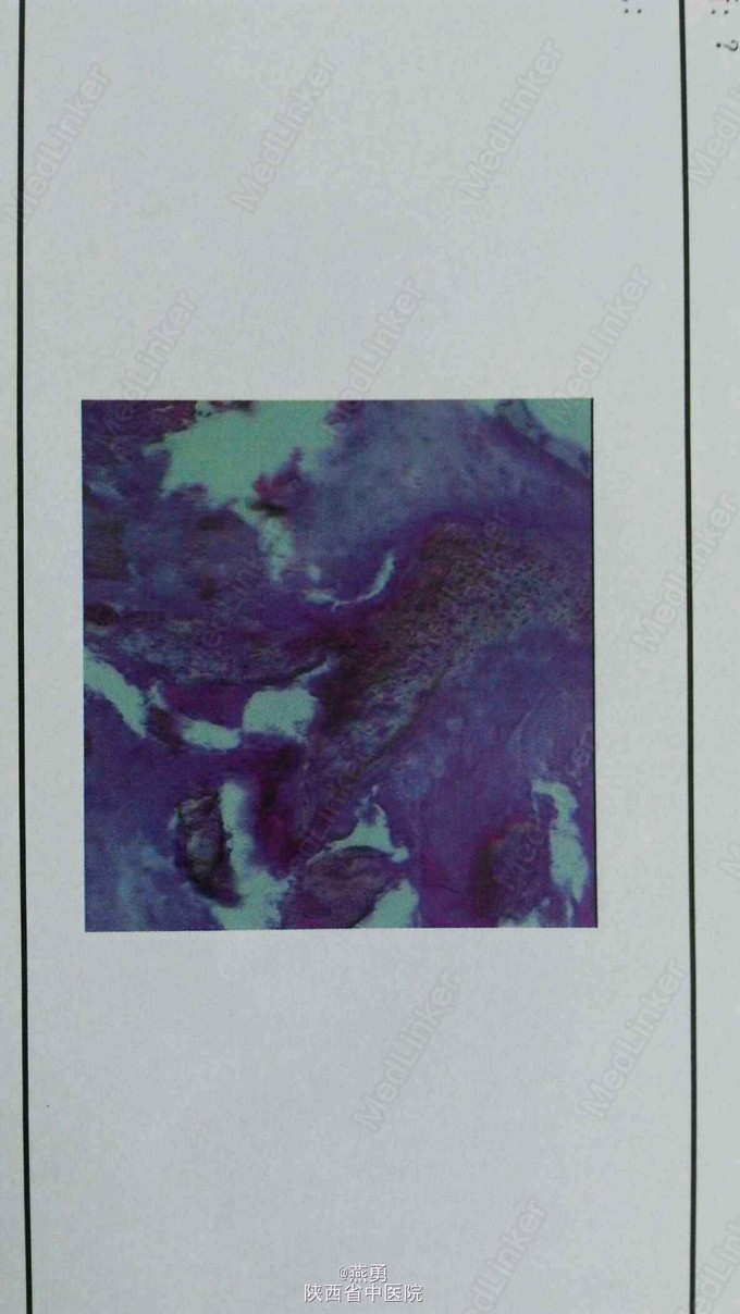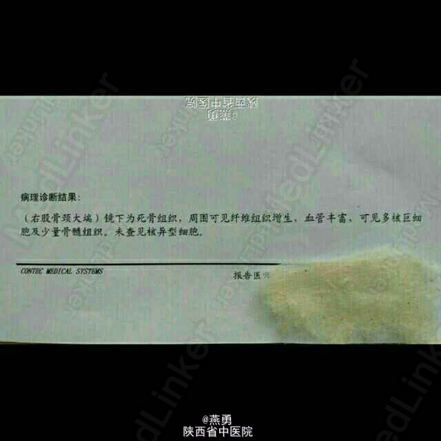 诊断:右股骨颈骨折,骨囊肿待查。治疗:右侧人工股骨头置换术,病灶清除探查术。麻醉生效后,常规逐层切开及暴露可见股骨颈颈中型骨折,清除周围纤维增生挛缩及瘢痕组织,取头器取出断裂的股骨头,患肢内收外旋脱位后,截骨,髓腔开口及扩髓,探针可见小转子内测约0.5*0.8cm病灶空腔,内壁完整,刮除腔内病灶送病检,填入少量抗生素型骨水泥,装入生物型股骨柄,置入双动头股骨头假体,复位,见右侧髋关节屈伸旋转活动良好,未出现脱位,双下肢等长。冲洗,清点纱布器械后,放置引流,关闭伤口加压包扎。 术后安返病房行预防感染预防血栓及对症治疗。