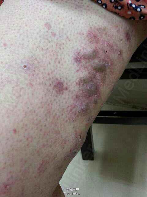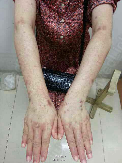 面部以眼睑为中心水肿性红斑,四肢伸侧红斑、丘疹,轻微脱屑。右大腿内侧数个紫红色结节。双侧三角肌压痛(+)。 ANA 1:320阳性。血象白细胞降低、血红蛋白低。生化示肌酶、转氨酶升高。肌电图提示肌源性改变。活检暂未同意。